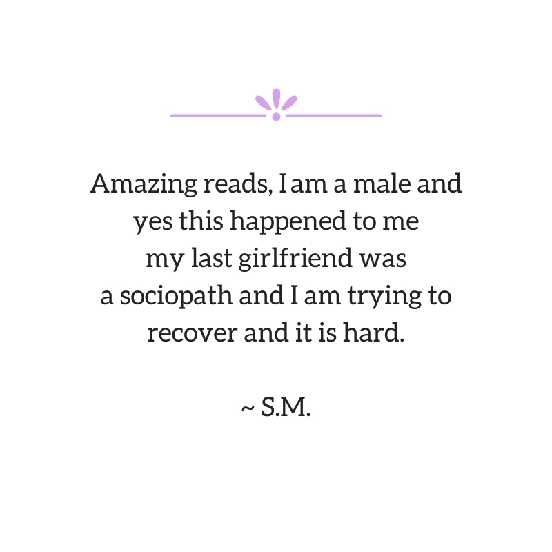 With accurate and true information and understanding of what a sociopath is – and what we are as gorgeous, loving humane, human beings, we can heal and get our lives back. We can trust again, laugh again, and love again.