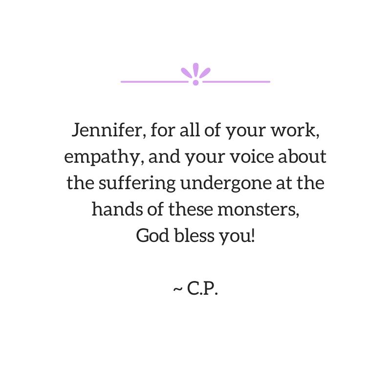I don’t think I would be where I am if I hadn’t found you and learned from you, and I’m still learning. Thanks for all you are doing to raise awareness of these monsters. ~ J.S.
